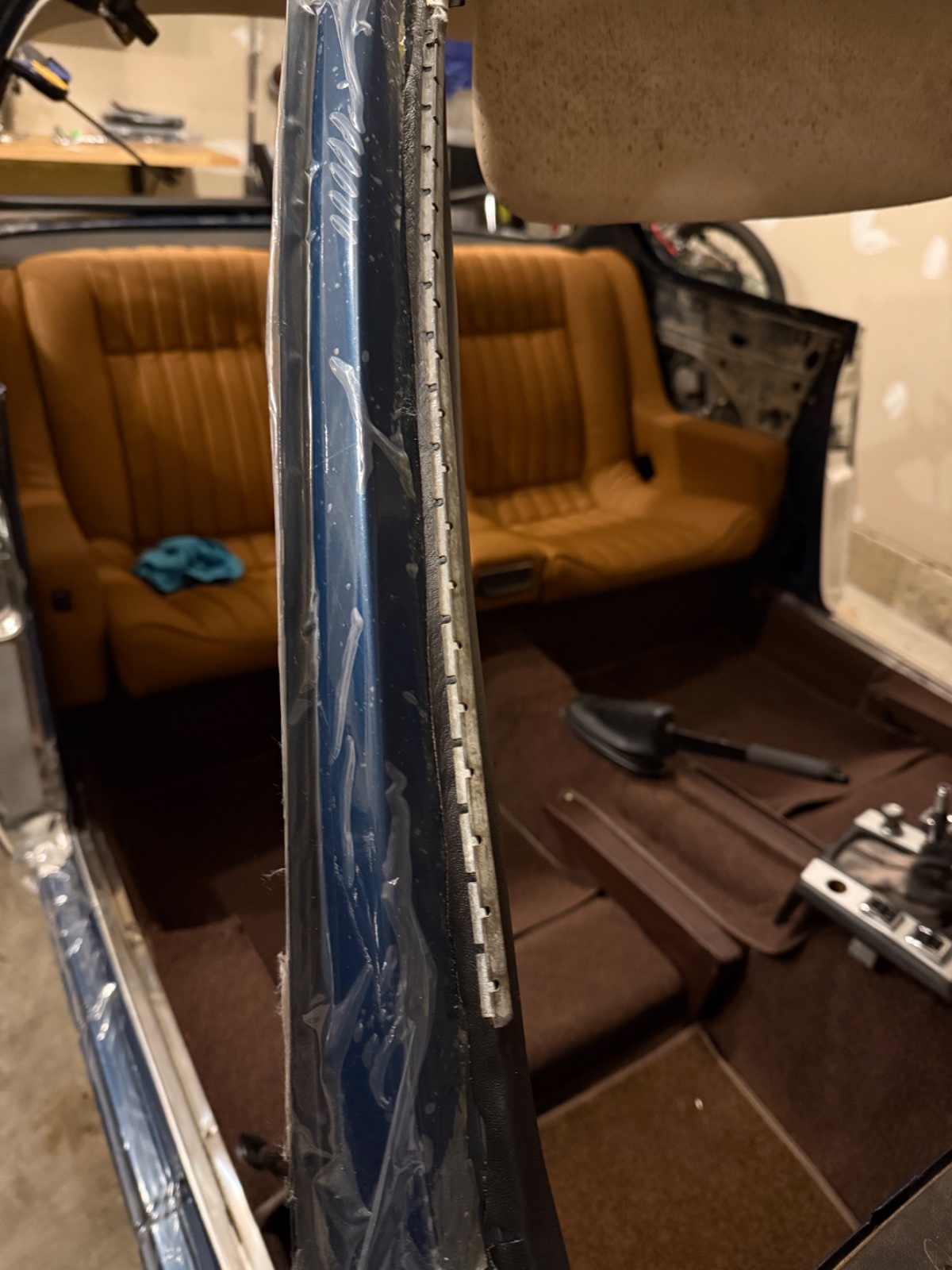 The vinyl for the A-pillar, headliner, and C-pillar are glued directly to the sheet metal.